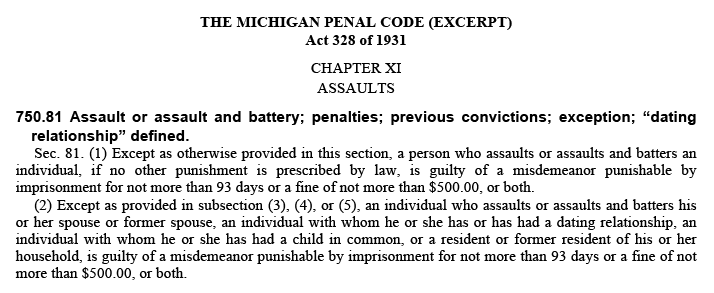 There are several different kinds of assault and battery charges in Michigan, with varying levels of punishment. Covered under MCL 750.81, these charges are broken up specifically into assault and assault and battery, depending on whether actual physical harm was inflicted. It should be noted that assault is defined as the threat of inflicting harm or giving one a reasonable fear of physical harm, whereas battery is when actual bodily harm is inflicted upon another. Below is a comprehensive list of all assault and battery charges in Michigan.